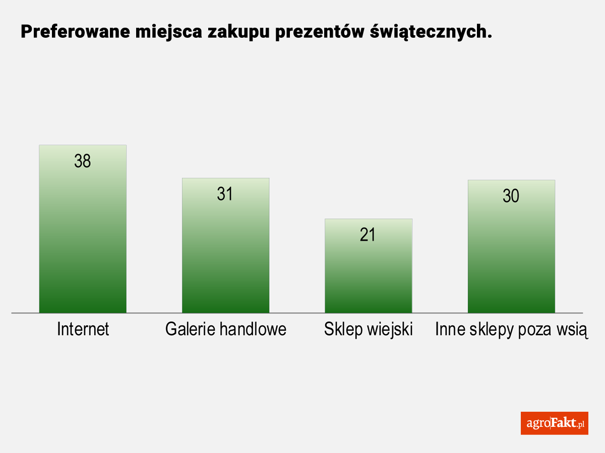 Świąteczne wydatki rolników na prezenty pokrywają się z preferencjami zakupowymi społeczeństwa. Z bożonarodzeniowych prezentów trudno bowiem zrezygnować. 38% z nich kupuje prezenty przez internet. Pozostali wybierają upominki w sklepach stacjonarnych – głównie poza wsią (aż 60,5%, w tym 30,5% kupuje w galeriach handlowych). Poza tym rolnicy nie lubią odwiedzać zbyt wielu sklepów w okresie przedświątecznym. Dr Paweł Trojanowski (Martin & Jacob) tak komentuje wyniki analizy przeprowadzonej wśród rolników: