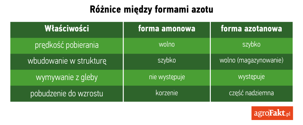 Formy amonowa i azotanowa różnią się przede wszystkim prędkością pobierania przez roślinę i tempem wymywania z gleby. Amonowa postać azotu jest wolniej pobierana przez roślinę, jednakże od razu wbudowywana jest w jej struktury; nie ulega również wymywaniu z gleby. Forma azotanowa jest z kolei pobierana przez roślinę bardzo szybko i w dużych ilościach, po czym magazynowana jest w komórkach rośliny. Ważne jest również, że forma azotanowa pobudza do rośnięcia część nadziemną rośliny, a amonowa – korzenie.