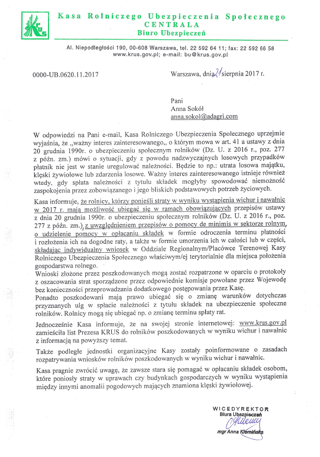 Przypominamy jednak, że z dniem 1 września 2017 zarówno ANR jak i Agencja Rynku Rolnego (ARR) przestaną istnieć. Zostaną zastąpione przez KOWR, czyli Krajowy Ośrodek Wsparcia Rolnictwa. Po tej zmianie poszkodowani będą mogli występować z wnioskami o odroczenie lub rozłożenie płatności do Dyrektora Generalnego KOWR.