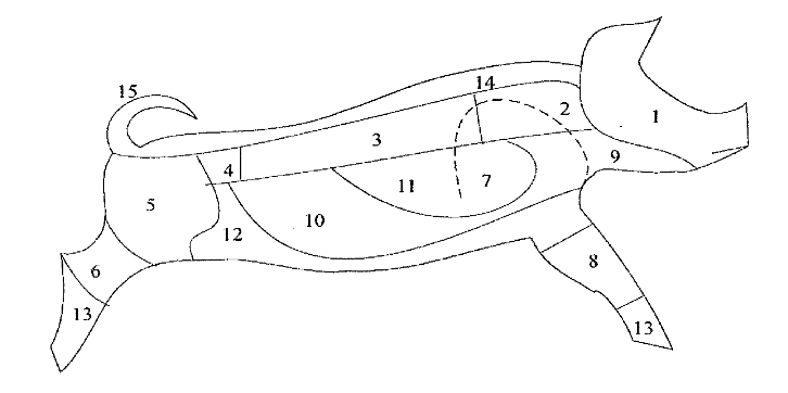 1–głowa, 2-karkówka, 3-schab, 4-biodrówka, 5-szynka, 6-golonka tylna, 7-łopatka,