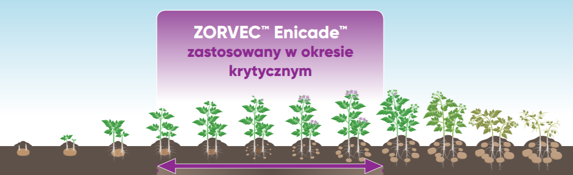 Dzięki temu liczba zabiegów w sezonie jest znacznie mniejsza, co wyraźnie zwiększa wydajność. Zastosowanie tak innowacyjnego fungicydu eliminuje problem odporności krzyżowej z innymi substancjami czynnymi fungicydów. Stosowanie fungicydu ZorvecTM należy rozpocząć w okresie od ok. 20 dni po wschodach ziemniaka, czyli podczas intensywnego wzrostu masy wegetatywnej. Kontynuowanie zabiegów zaleca się przez cały czas zawiązywania bulw. Ważne jest, aby pierwszy zabieg wykonany był jeszcze zanim pojawią się pierwsze objawy choroby. Fungicyd należy stosować z innym produktem, zawierającym substancję aktywną z innej grupy chemicznej, dedykowanym zwalczaniu zarazy ziemniaka.