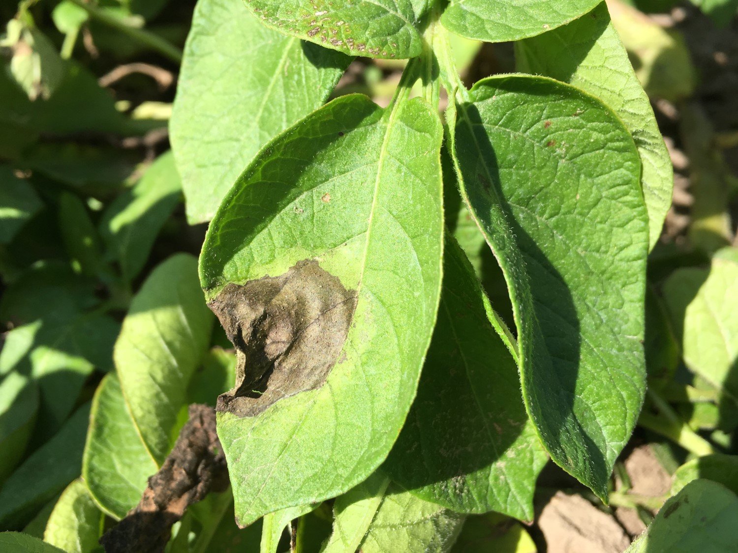 Duże brunatne plamy na brzegach liści z widocznym okrągłym pierścieniem w środku to typowy objaw zarazy ziemniaka