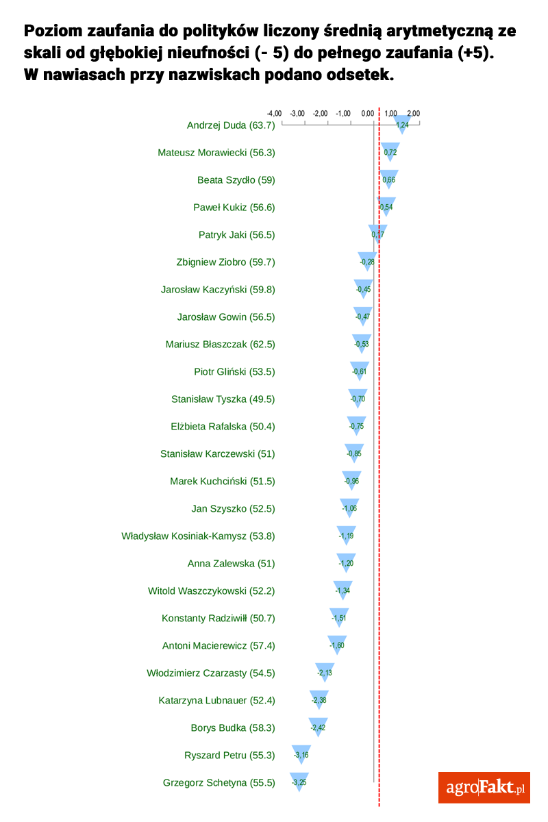 Politycy, którzy uzyskali nadwyżkę zaufania nad nieufnością to głównie „twarze” PiS. Należą do nich kolejno: Andrzej Duda (1,24), Mateusz Morawiecki (0,72), Beata Szydło (0,66) oraz Paweł Kukiz (0,54). Na granicy pomiędzy zaufaniem a nieufnością balansują natomiast Zbigniew Ziobro oraz Patryk Jaki.