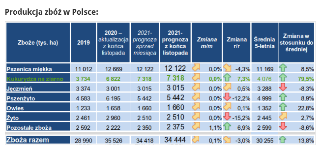 Więcej informacji o produkcji zbóż w Polsce zarówno w 2021 r., jak i w poprzednich lata przedstawia poniższa tabela: