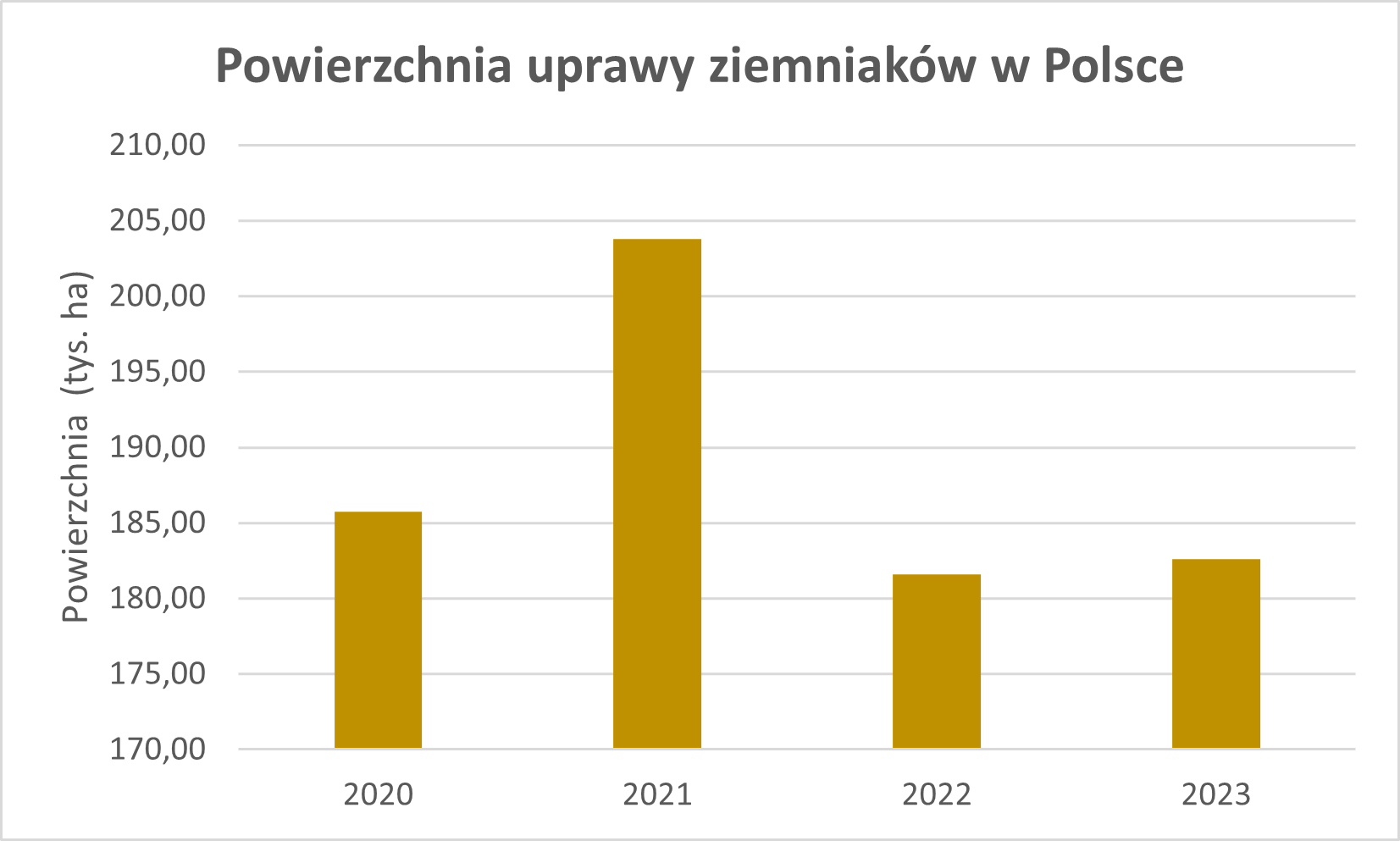 Dokładniejsze informacje dotyczące powierzchni uprawy ziemniaków podaje ARiMR. Według danych ARiMR, zebranych na podstawie wniosków o płatności bezpośrednie, areał profesjonalnej produkcji ziemniaków w Polsce w 2023 r. wynosił 182,63 tys. ha. W stosunku do 2022 r. powierzchnia produkcyjna była nieznacznie, gdyż o 1 tys. ha, większa. Jednak w relacji do poprzednich lat, tegoroczny areał produkcji jest mniejszy.