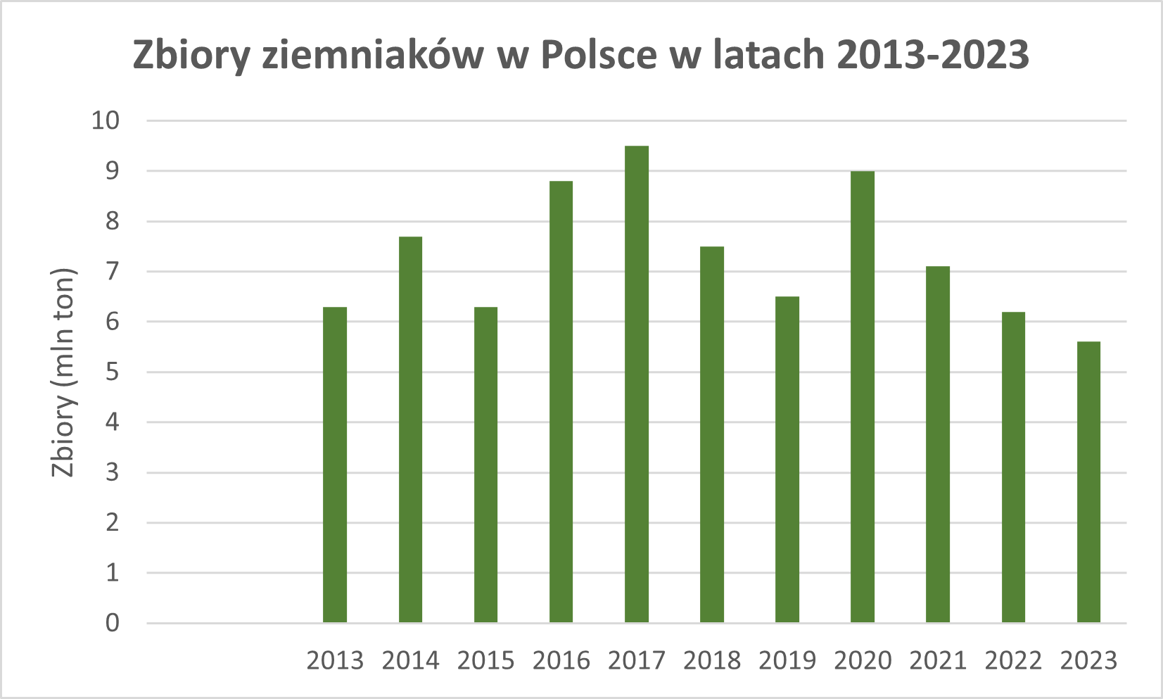 W porównaniu z rokiem 2017, kiedy produkcja ziemniaków była rekordowo wysoka i wynosiła 9,5 mln ton, w bieżącym sezonie zebraliśmy o niemal 4 mln ton mniej ziemniaków. Nawet w latach z najniższą produkcją w ostatnim dziesięcioleciu, tj. 2013, 2015, 2019 i 2022 zbiory były wyższe od tegorocznych i przekraczały 6 mln ton.