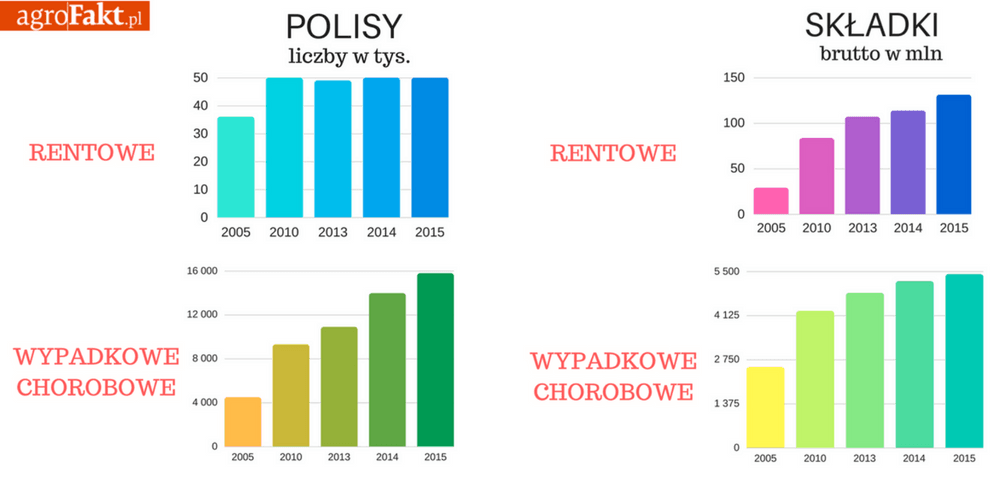 W przypadku obowiązkowych ubezpieczeń OC i budynków gospodarczych tendencje są wzrostowe. Według słów Prezesa KRIR spośród rolników zobowiązanych do opłacenia składek na ubezpieczenie budynków umowy zawiera 90% tych osób. Podobnie jest z dobrowolnymi ubezpieczeniami upraw roślinnych. Natomiast coraz mniej rolników z własnej inicjatywy ubezpiecza zwierzęta hodowlane. W 2005 roku zawarto 38 tys. polis dot. zwierząt natomiast w 2015 jedynie 12 tys. O ile w przypadku obowiązkowych ubezpieczeń różnice nie są aż tak znaczące, to w 2015 roku zawarto o 176 tys. ubezpieczeń upraw więcej niż w 2005 i o 154 tys. więcej niż w 2014. Również łączna suma składek rośnie. W 2015 roku składki ogółem wyniosły 25862,5 mln złotych. W 2005, 2014 i 2015 wyglądało to tak: