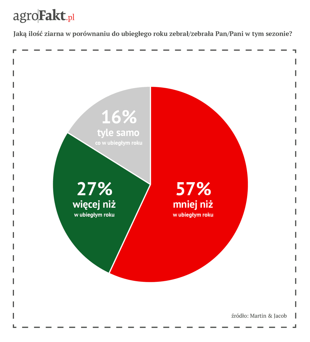 Prawie 57% uczestniczących w badaniu rolników oceniło, że w tym roku zebrało mniej ziarna niż rok temu. 16% rolników (99 osób) podało, że w ich ocenie zbiory są podobne do ubiegłego roku, a 27% (166 osób) stwierdziło, że ten rok był korzystniejszy i zebrali więcej ziarna niż w roku ubiegłym.