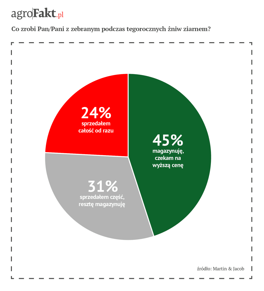 Jedynie niecałe 24% rolników (146 osób) powiedziało, że od razu po zbiorach sprzedało ziarno. Ponad 31% (193 osoby) część ziarna sprzedały, a część magazynują, a zdecydowanie najwięcej, bo prawie 45% ankietowanych (275 osób) odpowiedziało, że zboże magazynuje, czekając na wyższą cenę.