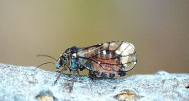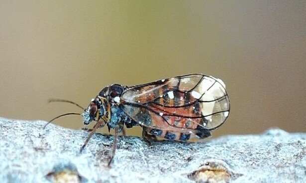 Zwalczanie miodówki gruszowej w sezonie 2025 nie będzie łatwe. Po pierwsze z powodu dużego nasilenia szkodnika. Po drugie ważna insektycydowa substancja czynna będzie musiała być ograniczona w użyciu. Mimo opryskania grusz glinką samica nie zniechęciła się do składania jaj (zdjęcie wykonane w 13. tygodniu 2025 r.)