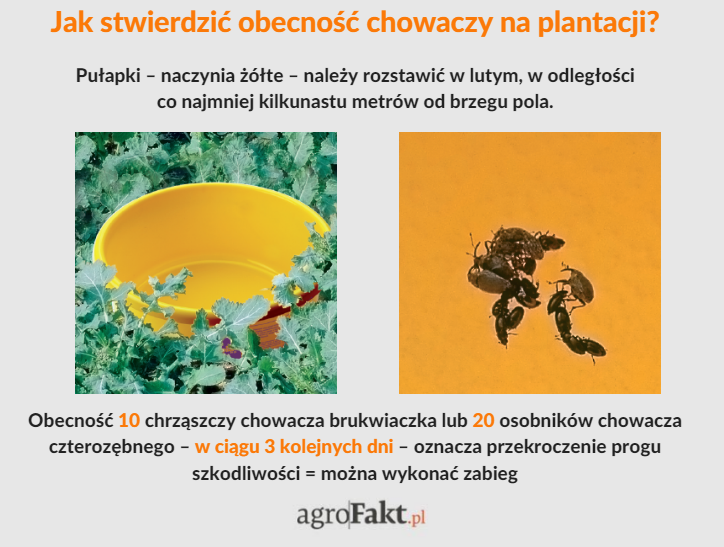Rolnicy często podejmują pochopnie decyzję o stosowaniu insektycydów na początku wiosennej wegetacji, nie zwracając uwagi na odpowiednie temperatury. Chowacze czasem pojawiają się na roślinach już pod koniec lutego lub na początku marca. Nie oznacza to, że zwalczanie szkodników łodygowych w rzepaku trzeba rozpocząć natychmiast. Należy pamiętać, że zabieg powinno się wykonać jeśli liczebność chowacza brukwiaczka w naczyniu żółtym wyniesie 10 sztuk, a chowacza czterozębnego 20 sztuk przez 3 kolejne dni odłowów. W przypadku czerpakowania roślin, wartością progową jest stwierdzenie średnio 2-4 chrząszczy brukwiaczka lub 6 czterozębnego na 25 roślinach.